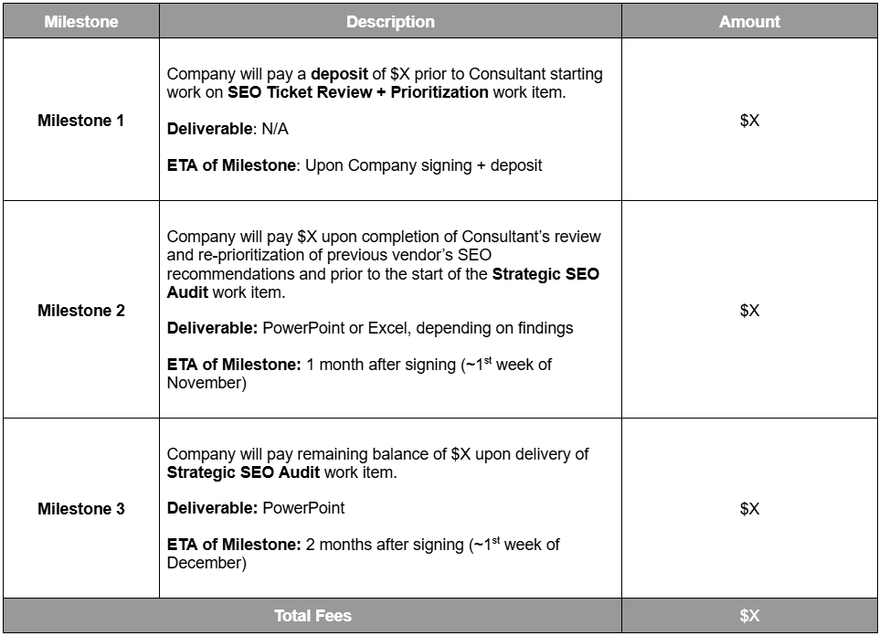 Hi there, Different client needs give independent consultants and freelancers the opportunity to bill in a manner that is mutually beneficial. A retainer model works best for my goals, however, it’s not for every situation nor consultant. In today’s newsletter, I discuss 3 different types of billing methods consultants may consider when engaging in new client work. Hourly Billing / Time and MaterialsWhen engaging in hourly billing, or time and materials, I bill for every hour I work. This is popular for freelancers, contractors, and ad hoc work. The benefit to this approach… When I provide specialized services for one of my niches (SFCC or migrations), I can command a higher billable rate because there are fewer SEOs that can do what I do. Conversely, if I contract for a 3rd party agency, they have their pick of SEOs so to remain competitive I must lower my hourly rate. This isn’t ideal. Another downside to hourly billing is, unlike other value-based contracts that package services, I’m still trading time for money. I don’t completely shy away from this model but I don’t prioritize it. Fixed-fee ProjectsFixed fee projects have 1 price tag, which is paid out based on the agreed upon terms. Brands are receptive to this model as they aren't locked into a long term engage but still gain value from freelancers. I typically engage under this model for SEO audits or reviews. Under my payment terms, a deposit has to be paid prior to the start of work. Additionally, I can divide the lump sum into milestones paid out over time. I’ve found his approach helpful on projects with diverse needs. For example, the below payment distribution is an example from a previous engagement that centers around 3 milestones. If I plan accordingly, these types of projects can be liberating and lucrative. Similar to hourly projects, however, they are finite and once they’re done the engagement ends. Fixed-fee projects aren’t totally secure but I find the predictability much more appealing than hourly billing. Retainer-basedUnder my current circumstances, I prefer the stability and predictability that retainer method brings. During such an engagement, the client and I enter into a service agreement for a duration of time, ideally 6 months to a year, where my payment terms are monthly. In my case, I charge the last month upfront, which serves as a deposit. Naturally, both parties are committed and I won’t have the fluidity of moving on to new clients but it brings financial security. What’s more, the retainer model allows both the client and I to see our optimizations through the long term. Which Billing Method is Right for You?This is a very profound question. You have to be honest with yourself and your circumstances as a freelancer. Do you have the time to take on multiple retainer clients, or could you spread the projects out using a fixed-fee approach? Would you rather work at an hourly rate and, if so, do you feel comfortable with how much is billed? For me, I prefer the retainer model but love when I’m balancing a long term retainer with fixed-fee projects. I feel this dynamic doesn’t stretch me thin but is also lucrative. Don't Lose Sight of Client NeedsIt’s easy to get excited about a sale and the prospect of long term revenue. But the opportunity shouldn’t come at the expense of client needs. For example, I won’t pitch a 12 month engagement if the client is looking for issues plaguing their site after a migration; they would benefit from an audit or review. Brands have often told me that vendors pitch services with unfavorable payment terms that are irrelevant and disjointed from their actual needs. If you’re looking to maintain your brand, then don’t sell something that clients don’t want. Preparing for Your Next ProjectHaving a firmer understanding of billing models, you can be more intentional with how you earn income. In tandem with the above, hone in on your SEO proposals and contract preparation to build an engagement that benefits your clients as much as you. Edwin RomeroIndependent SEO Consultant
